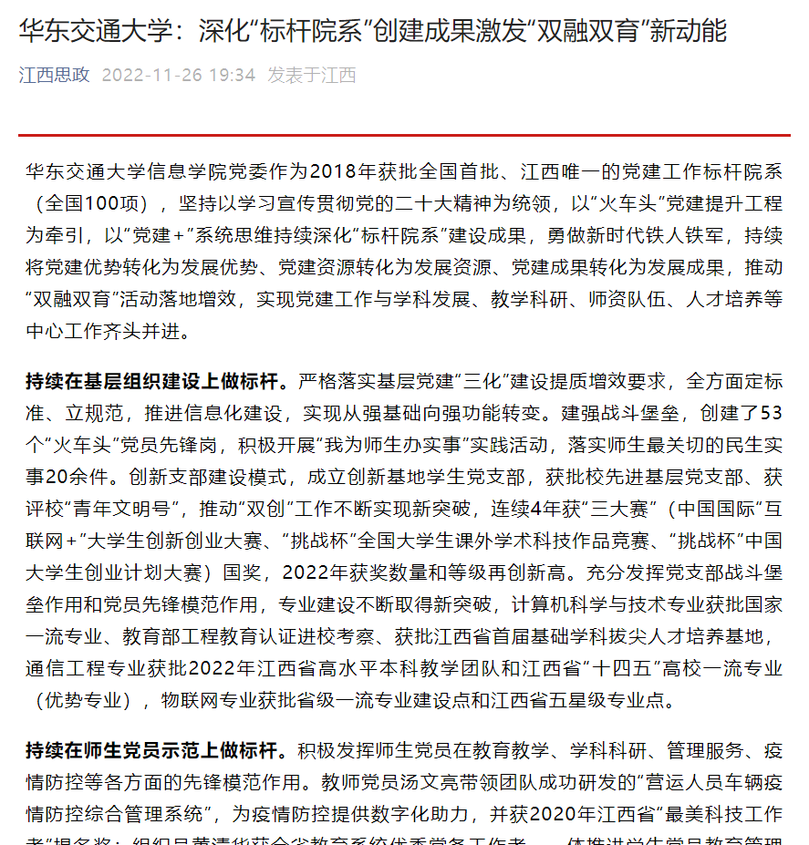 持续在基层组织建设上做标杆。严格落实基层党建“三化”建设提质增效要求,全方面定标准、立规范,推进信息化建设,实现从强基础向强功能转变。建强战斗堡垒,创建了53个“火车头”党员先锋岗,积极开展“我为师生办实事”实践活动,落实师生最关切的民生实事20余件。创新支部建设模式,成立创新基地学生党支部,获批校先进基层党支部、获评校“青年文明号”,推动“双创”工作不断实现新突破,连续4年获“三大赛”(中国国际“互联网+”大学生创新创业大赛、“挑战杯”全国大学生课外学术科技作品竞赛、“挑战杯”中国大学生创业计划大赛)国奖,2022年获奖数量和等级再创新高。充分发挥党支部战斗堡垒作用和党员先锋模范作用,专业建设不断取得新突破,计算机科学与技术专业获批国家一流专业、教育部工程教育认证进校考察、获批江西省首届基础学科拔尖人才培养基地,通信工程专业获批2022年江西省高水平本科教学团队和江西省“十四五”高校一流专业(优势专业),物联网专业获批省级一流专业建设点和江西省五星级专业点。