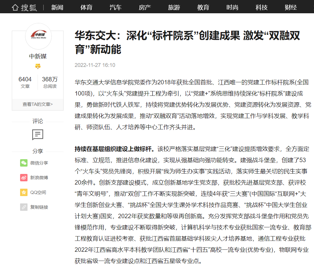 持续在基层组织建设上做标杆。该校严格落实基层党建“三化”建设提质增效要求,全方面定标准、立规范,推进信息化建设,实现从强基础向强功能转变。建强战斗堡垒,创建了53个“火车头”党员先锋岗,积极开展“我为师生办实事”实践活动,落实师生最关切的民生实事20余件。创新支部建设模式,成立创新基地学生党支部,获批校先进基层党支部、获评校“青年文明号”,推动“双创”工作不断实现新突破,连续4年获“三大赛”(中国国际“互联网+”大学生创新创业大赛、“挑战杯”全国大学生课外学术科技作品竞赛、“挑战杯”中国大学生创业计划大赛)国奖,2022年获奖数量和等级再创新高。充分发挥党支部战斗堡垒作用和党员先锋模范作用,专业建设不断取得新突破,计算机科学与技术专业获批国家一流专业、教育部工程教育认证进校考察、获批江西省首届基础学科拔尖人才培养基地,通信工程专业获批2022年江西省高水平本科教学团队和江西省“十四五”高校一流专业(优势专业),物联网专业获批省级一流专业建设点和江西省五星级专业点。