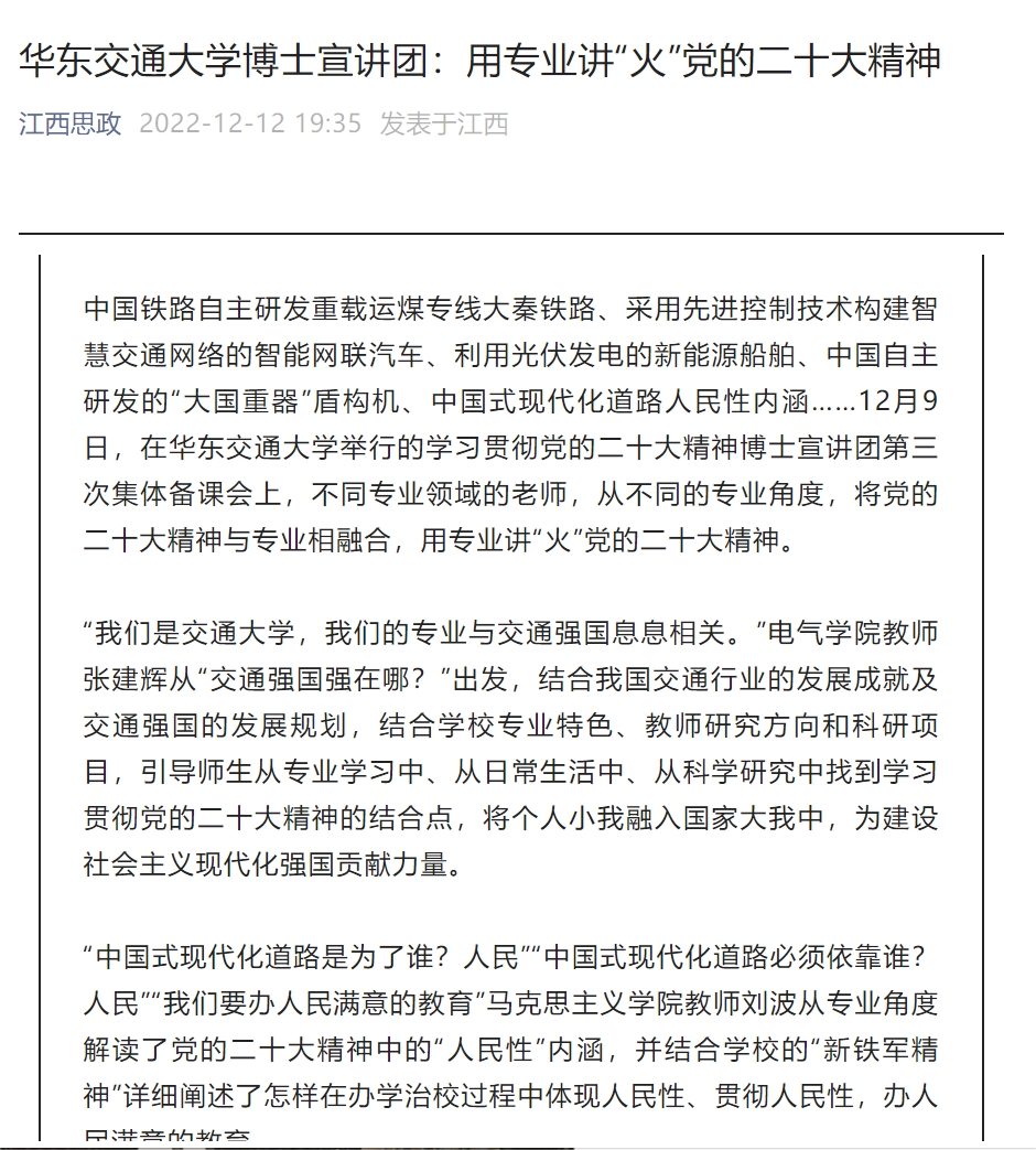 “我们是交通大学,我们的专业与交通强国息息相关。”电气学院教师张建辉从“交通强国强在哪?”出发,结合我国交通行业的发展成就及交通强国的发展规划,结合学校专业特色、教师研究方向和科研项目,引导师生从专业学习中、从日常生活中、从科学研究中找到学习贯彻党的二十大精神的结合点,将个人小我融入国家大我中,为建设社会主义现代化强国贡献力量。