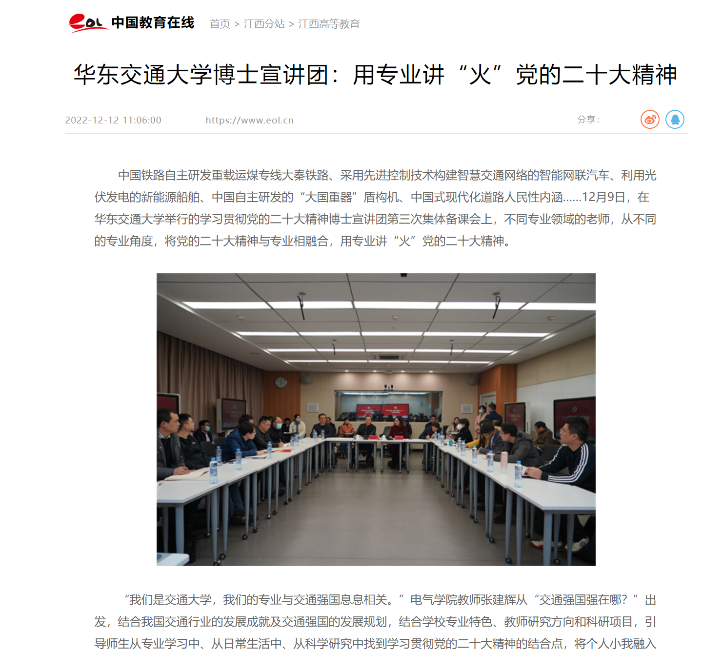 中国铁路自主研发重载运煤专线大秦铁路、采用先进控制技术构建智慧交通网络的智能网联汽车、利用光伏发电的新能源船舶、中国自主研发的“大国重器”盾构机、中国式现代化道路人民性内涵……12月9日,在beat365正版唯一官网必一举行的学习贯彻党的二十大精神博士宣讲团第三次集体备课会上,不同专业领域的老师,从不同的专业角度,将党的二十大精神与专业相融合,用专业讲“火”党的二十大精神。