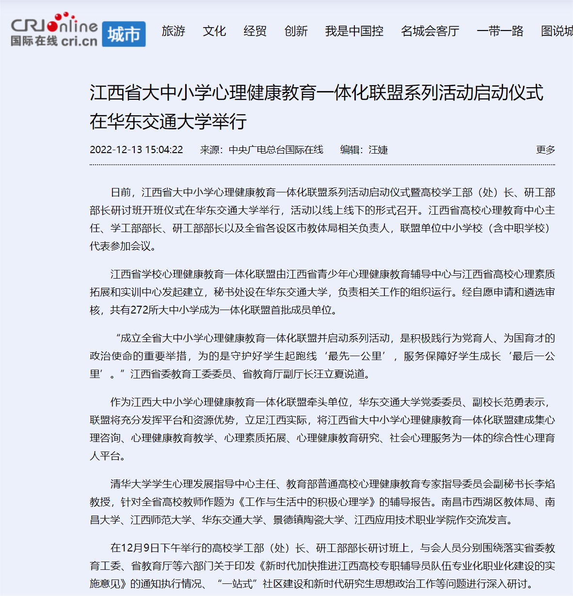 “成立全省大中小学心理健康教育一体化联盟并启动系列活动,是积极践行为党育人、为国育才的政治使命的重要举措,为的是守护好学生起跑线‘最先一公里’,服务保障好学生成长‘最后一公里’。”江西省委教育工委委员、省教育厅副厅长汪立夏说道。