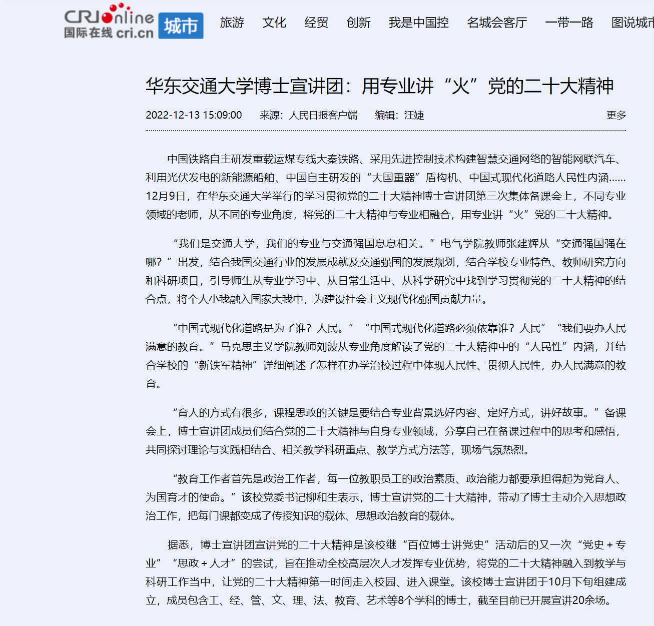 据悉,博士宣讲团宣讲党的二十大精神是该校继“百位博士讲党史”活动后的又一次“党史+专业”“思政+人才”的尝试,旨在推动全校高层次人才发挥专业优势,将党的二十大精神融入到教学与科研工作当中,让党的二十大精神第一时间走入校园、进入课堂。该校博士宣讲团于10月下旬组建成立,成员包含工、经、管、文、理、法、教育、艺术等8个学科的博士,截至目前已开展宣讲20余场。