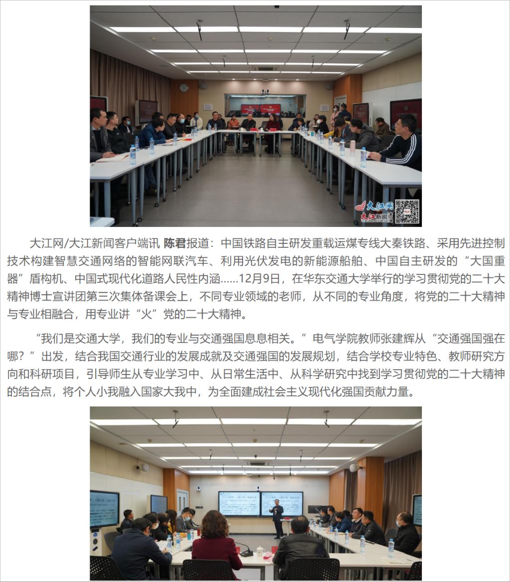 “我们是交通大学,我们的专业与交通强国息息相关。”电气学院教师张建辉从“交通强国强在哪?”出发,结合我国交通行业的发展成就及交通强国的发展规划,结合学校专业特色、教师研究方向和科研项目,引导师生从专业学习中、从日常生活中、从科学研究中找到学习贯彻党的二十大精神的结合点,将个人小我融入国家大我中,为全面建成社会主义现代化强国贡献力量。