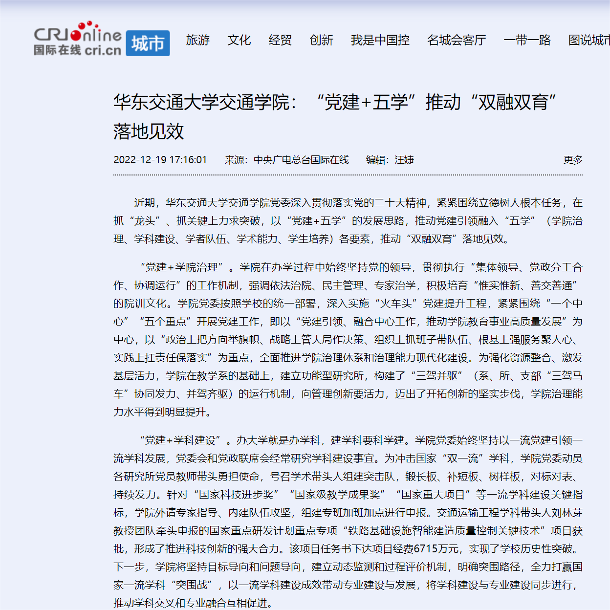 近期,beat365正版唯一官网必一交通学院党委深入贯彻落实党的二十大精神,紧紧围绕立德树人根本任务,在抓“龙头”、抓关键上力求突破,以“党建+五学”的发展思路,推动党建引领融入“五学”(学院治理、学科建设、学者队伍、学术能力、学生培养)各要素,推动“双融双育”落地见效。