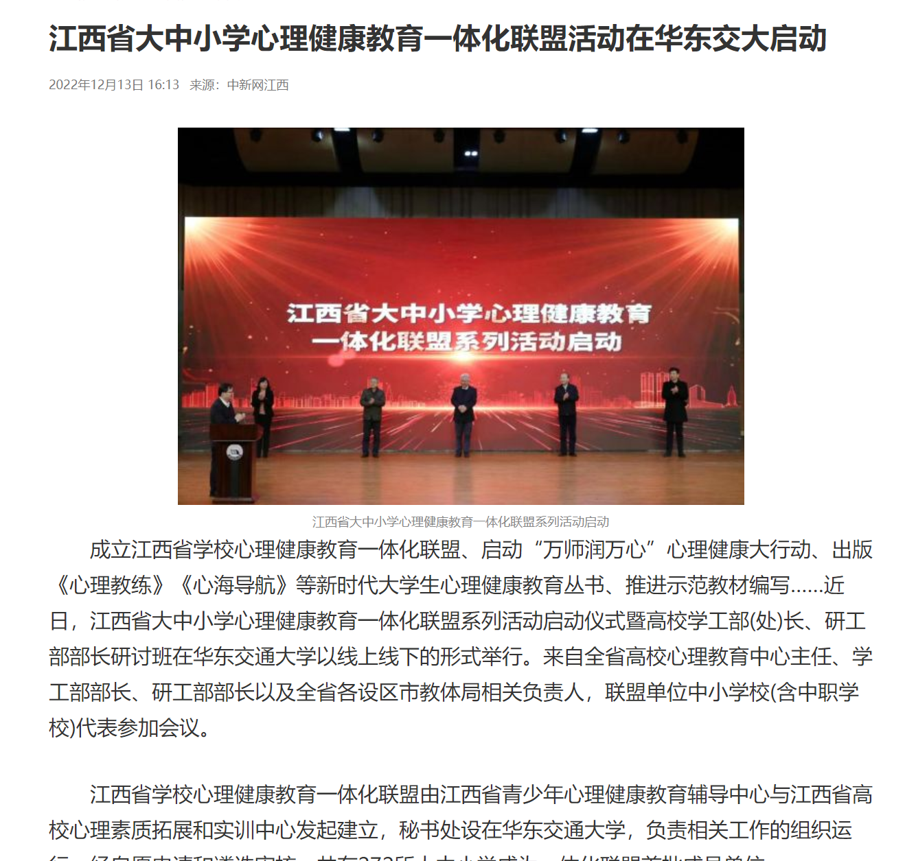 “成立全省大中小学心理健康教育一体化联盟并启动系列活动,是积极践行为党育人、为国育才的政治使命的重要举措。为的是守护好学生起跑线‘最先一公里’,服务保障好学生成长‘最后一公里’”,江西省委教育工委委员、省教育厅副厅长汪立夏说。