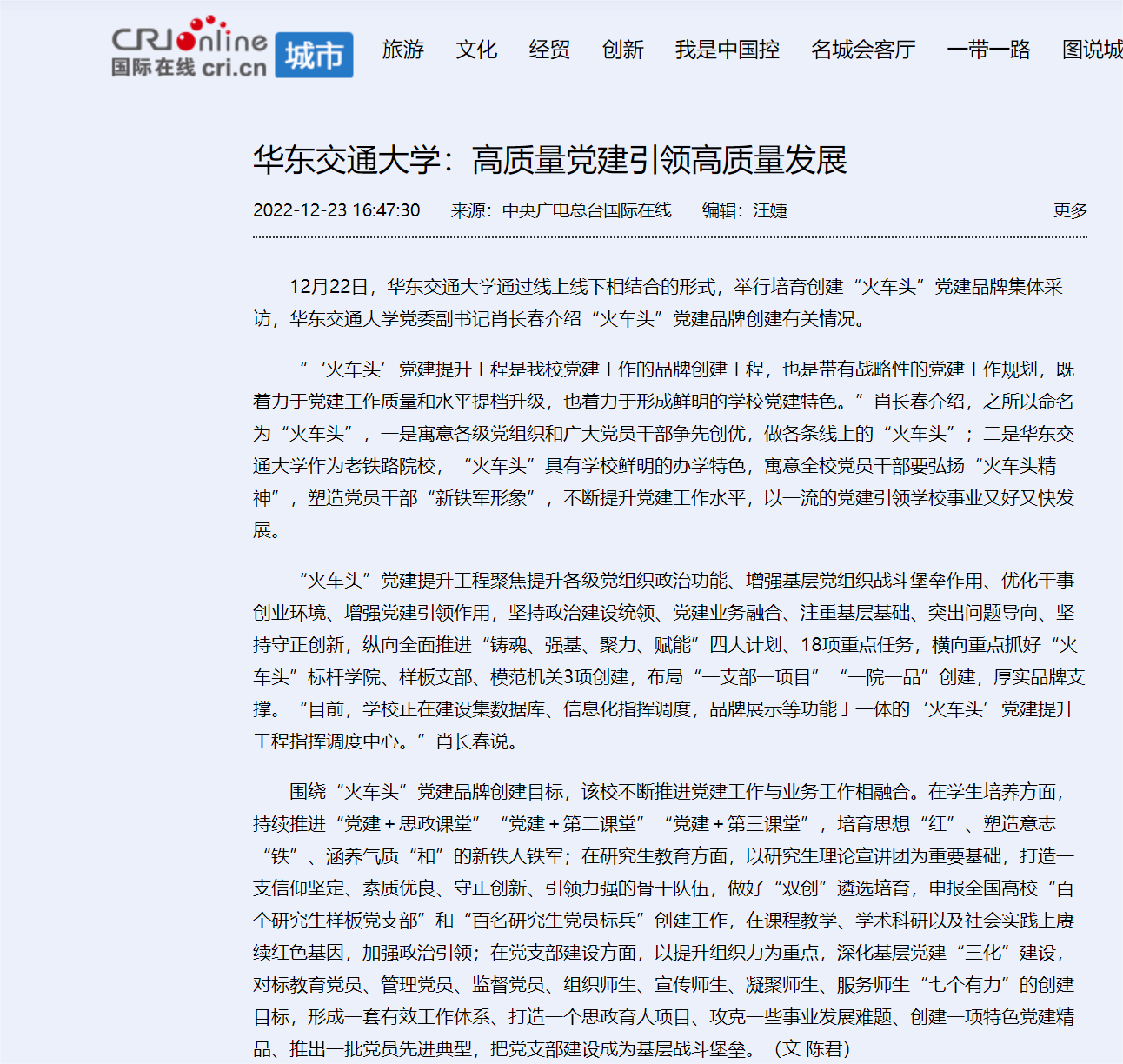 “火车头”党建提升工程聚焦提升各级党组织政治功能、增强基层党组织战斗堡垒作用、优化干事创业环境、增强党建引领作用,坚持政治建设统领、党建业务融合、注重基层基础、突出问题导向、坚持守正创新,纵向全面推进“铸魂、强基、聚力、赋能”四大计划、18项重点任务,横向重点抓好“火车头”标杆学院、样板支部、模范机关3项创建,布局“一支部一项目”“一院一品”创建,厚实品牌支撑。“目前,学校正在建设集数据库、信息化指挥调度,品牌展示等功能于一体的‘火车头’党建提升工程指挥调度中心。”肖长春说。
