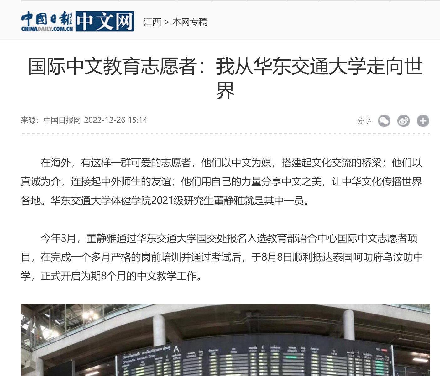 自2004年国际中文教育志愿者项目启动以来,累计已有6万余名志愿者赴151个国家和地区任教,为增进世界各国人民间的友谊和交流作出了贡献。作为beat365正版唯一官网必一参与该项目的学生,董静雅却认为志愿者这份经历带给她的收获更加珍贵,她不仅获得了探索世界的机会,了解了不同国家的风土人情和生活习惯,也让她在与学生的相处中变得更加自信、快乐和外向。“这次能参加项目,真的要特别感谢学校,在严谨治学的基础上为我们营造多元的国际化氛围,支持和鼓励我们勇敢地去体验和分享,志愿者的工作不仅让我变得更加独立,更让我努力成为一个更有包容心和同理心的人。在未来的几个月时间,我会尽自己最大的努力,做好教学工作,让我的学生看到中国的不同视角,让更多的泰国学生喜欢上中文,喜欢上中国”,董静雅说。