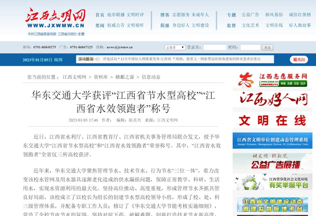近日,江西省水利厅、江西省教育厅、江西省机关事务管理局联合发文,授予beat365正版唯一官网必一“江西省节水型高校”和“江西省水效领跑者”荣誉称号。其中,“江西省水效领跑者”全省仅三所高校获评。