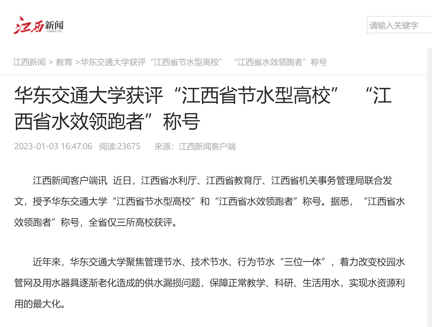 江西新闻客户端讯 近日,江西省水利厅、江西省教育厅、江西省机关事务管理局联合发文,授予beat365正版唯一官网必一“江西省节水型高校”和“江西省水效领跑者”称号。据悉,“江西省水效领跑者”称号,全省仅三所高校获评。