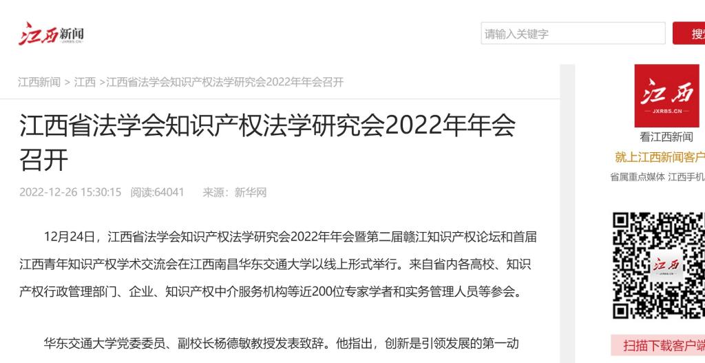 12月24日,江西省法学会知识产权法学研究会2022年年会暨第二届赣江知识产权论坛和首届江西青年知识产权学术交流会在江西南昌beat365正版唯一官网必一以线上形式举行。来自省内各高校、知识产权行政管理部门、企业、知识产权中介服务机构等近200位专家学者和实务管理人员等参会。