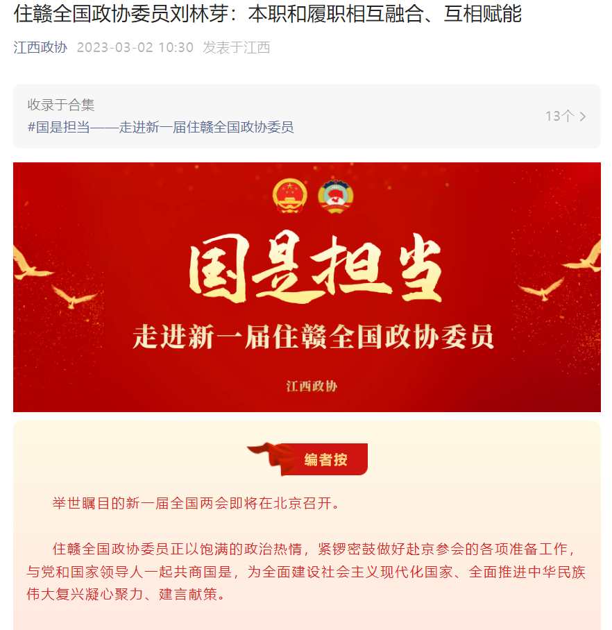 为迎接盛会,特别推出“国是担当——走进新一届住赣全国政协委员”专栏,充分展现住赣全国政协委员为国履职、为民尽责的风采。