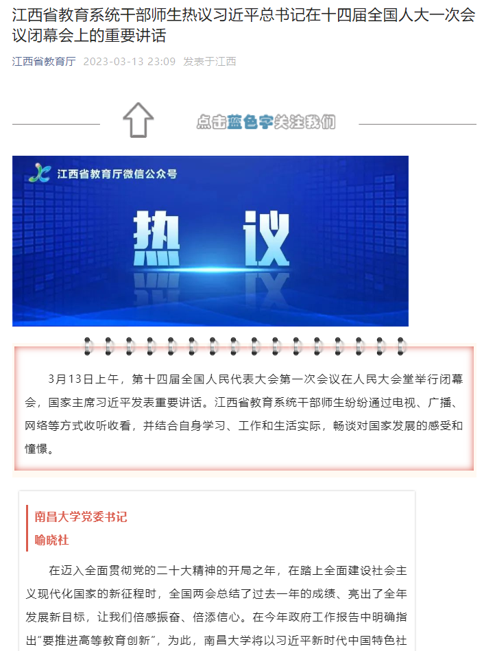 在迈入全面贯彻党的二十大精神的开局之年,在踏上全面建设社会主义现代化国家新征程时,全国两会总结了过去一年的成绩、亮出了全年发展新目标,让我们倍感振奋、倍添信心。在今年政府工作报告中明确指出“要推进高等教育创新”,为此,南昌大学将以习近平新时代中国特色社会主义思想为指引,深刻认识将“双一流”高校建设作为教育、科技、人才重要结合点和中国式现代化建设重要抓手的独特作用,坚定不移地贯彻落实科教兴国战略、人才强国战略和创新驱动发展战略,坚持科学教育理念,落实立德树人根本任务,坚持走创新发展之路,推进科技创新和人才队伍建设,以学校的高质量内涵式发展为江西经济社会高质量发展提供基础性、战略性支撑。