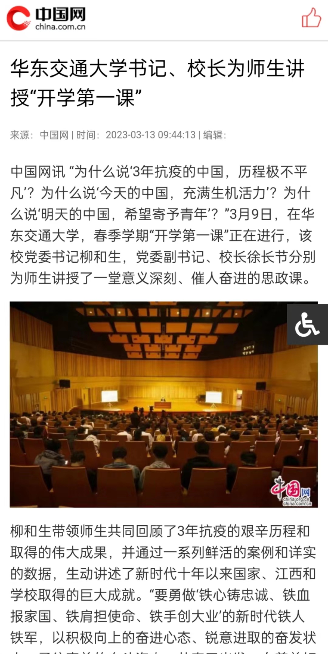 柳和生带领师生共同回顾了3年抗疫的艰辛历程和取得的伟大成果,并通过一系列鲜活的案例和详实的数据,生动讲述了新时代十年以来国家、江西和学校取得的巨大成就。“要勇做‘铁心铸忠诚、铁血报家国、铁肩担使命、铁手创大业’的新时代铁人铁军,以积极向上的奋进心态、锐意进取的奋发状态、勇往直前的奋斗姿态,从春天出发,向着美好的未来奋跃而上,在中国式现代化的壮阔征程中扛起青春责任、彰显青春担当,展现青春力量、谱写青春华章。”柳和生寄语青年师生。