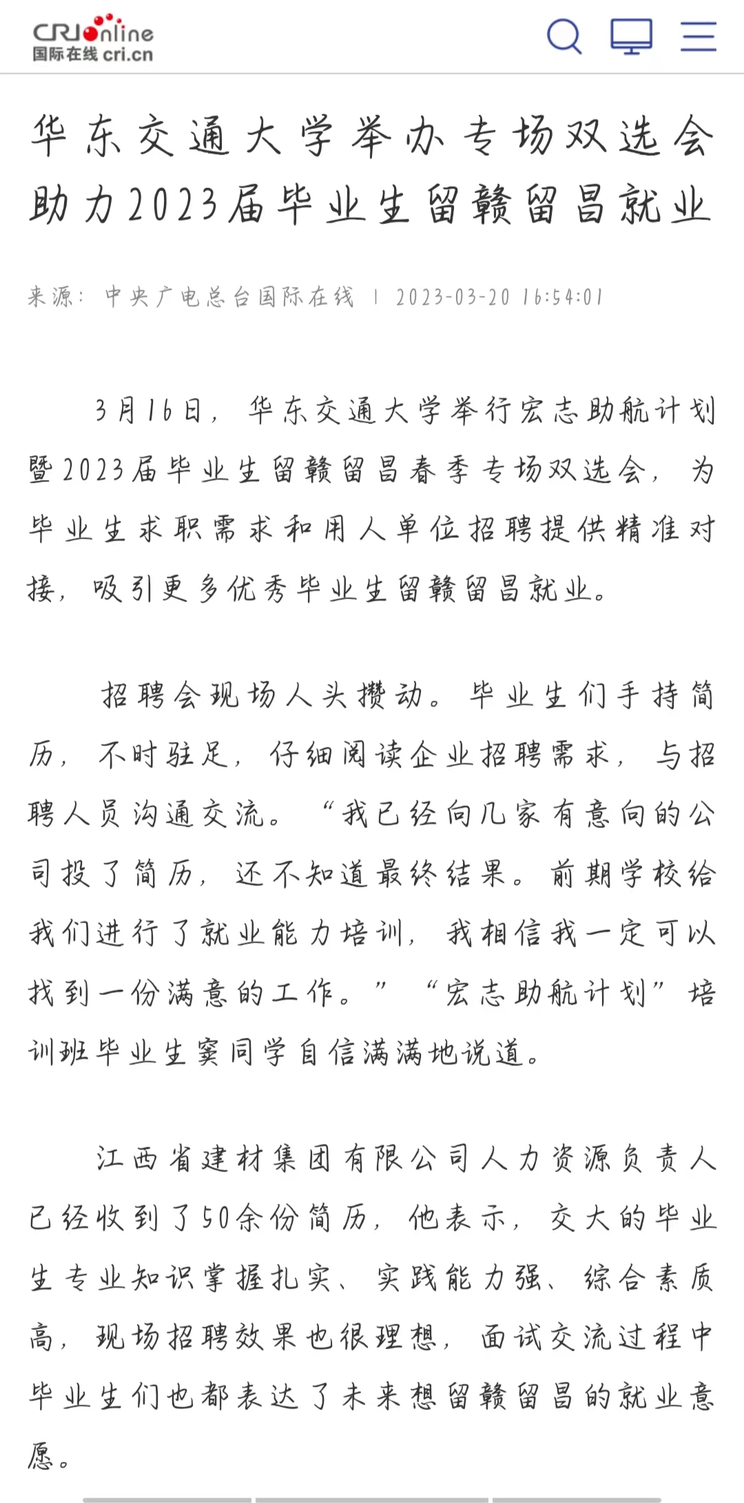 江西省建材集团有限公司人力资源负责人已经收到了50余份简历,他表示,交大的毕业生专业知识掌握扎实、实践能力强、综合素质高,现场招聘效果也很理想,面试交流过程中毕业生们也都表达了未来想留赣留昌的就业意愿。