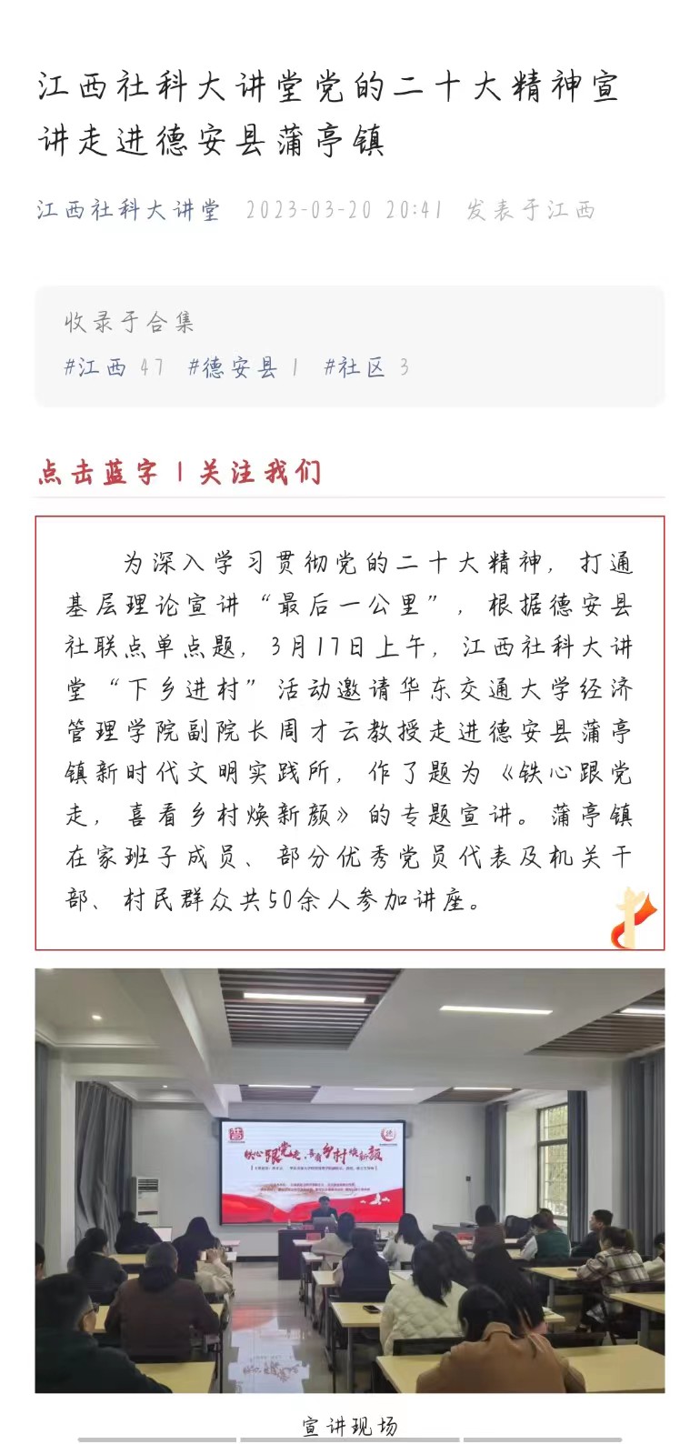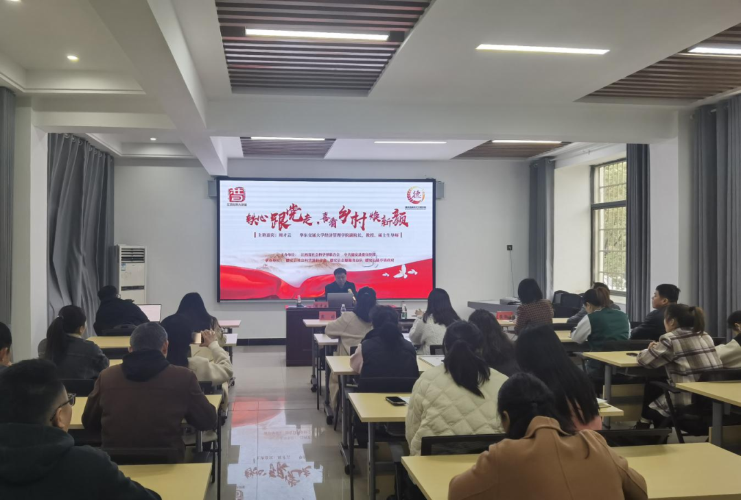 为深入学习贯彻党的二十大精神,打通基层理论宣讲“最后一公里”,根据德安县社联点单点题,3月17日上午,江西社科大讲堂“下乡进村”活动邀请beat365正版唯一官网必一经济管理学院副院长周才云教授走进德安县蒲亭镇新时代文明实践所,作了题为《铁心跟党走,喜看乡村焕新颜》的专题宣讲。蒲亭镇在家班子成员、部分优秀党员代表及机关干部、村民群众共50余人参加讲座。