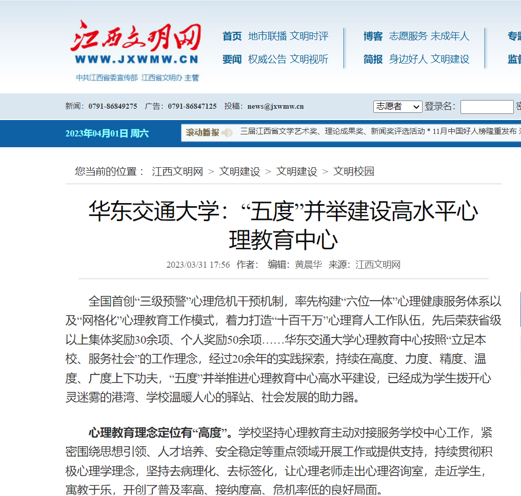 全国首创“三级预警”心理危机干预机制,率先构建“六位一体”心理健康服务体系以及“网格化”心理教育工作模式,着力打造“十百千万”心理育人工作队伍,先后荣获省级以上集体奖励30余项、个人奖励50余项……beat365正版唯一官网必一心理教育中心按照“立足本校、服务社会”的工作理念,经过20余年的实践探索,持续在高度、力度、精度、温度、广度上下功夫,“五度”并举推进心理教育中心高水平建设,已经成为学生拨开心灵迷雾的港湾、学校温暖人心的驿站、社会发展的助力器。