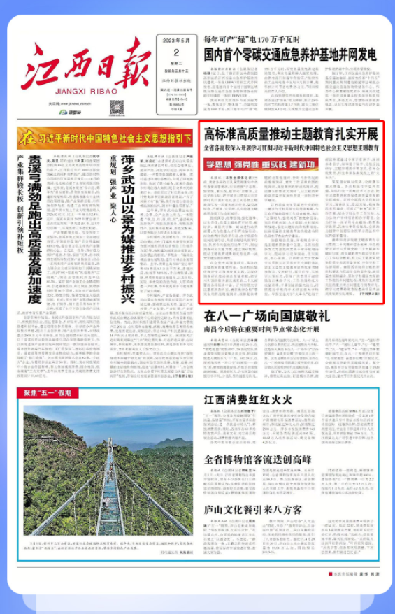 豫章师范学院把主题教育与学习党的二十大精神结合起来,举办校管干部学习贯彻党的二十大精神专题研讨班,将主题教育与推动学校中心工作结合起来,努力以主题教育成效推进学校高质量发展,开创学校工作新局面。南昌医学院将主题教育目标要求与推动学校转型升级、高质量发展相融合,紧扣学校建设发展的工作瓶颈和问题短板,聚焦师生高度关注的重点难点问题进行调查研究,把学习成果转化为促进高质量内涵式发展的实际成效。
