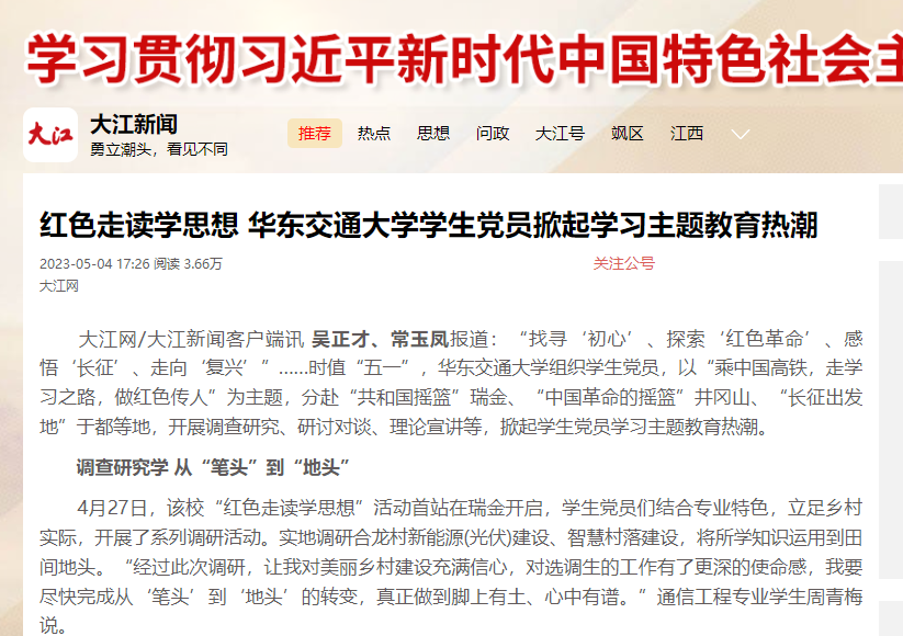 4月27日,该校“红色走读学思想”活动首站在瑞金开启,学生党员们结合专业特色,立足乡村实际,开展了系列调研活动。实地调研合龙村新能源(光伏)建设、智慧村落建设,将所学知识运用到田间地头。“经过此次调研,让我对美丽乡村建设充满信心,对选调生的工作有了更深的使命感,我要尽快完成从‘笔头’到‘地头’的转变,真正做到脚上有土、心中有谱。”通信工程专业学生周青梅说。
