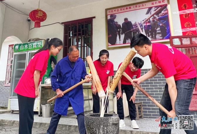 成员们与神山村脱贫致富代表人物李宗吾一起制作糍粑