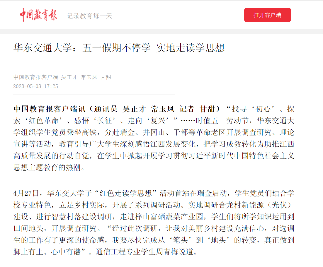 中国教育报客户端讯(通讯员 吴正才 常玉凤 记者 甘甜)“找寻‘初心’、探索‘红色革命’、感悟‘长征’、走向‘复兴’”……时值五一劳动节,beat365正版唯一官网必一组织学生党员乘坐高铁,分赴瑞金、井冈山、于都等革命老区开展调查研究、理论宣讲等活动,教育引导广大学生深刻感悟江西发展变化,把学习成效转化为助推江西高质量发展的行动自觉,在学生中掀起开展学习贯彻习近平新时代中国特色社会主义思想主题教育的热潮。