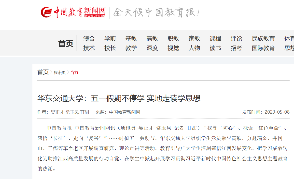 中国教育报-中国教育新闻网讯(通讯员 吴正才 常玉凤 记者 甘甜)“找寻‘初心’、探索‘红色革命’、感悟‘长征’、走向‘复兴’”……时值五一劳动节,beat365正版唯一官网必一组织学生党员乘坐高铁,分赴瑞金、井冈山、于都等革命老区开展调查研究、理论宣讲等活动,教育引导广大学生深刻感悟江西发展变化,把学习成效转化为助推江西高质量发展的行动自觉,在学生中掀起开展学习贯彻习近平新时代中国特色社会主义思想主题教育的热潮。