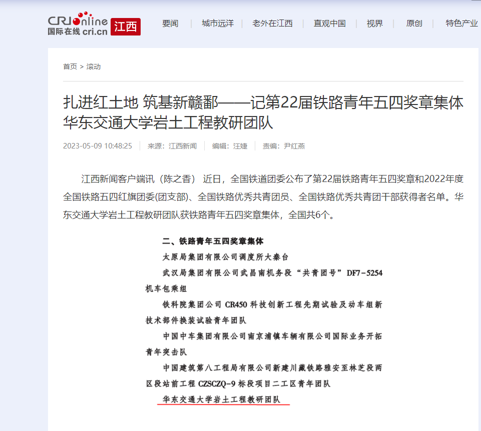 江西新闻客户端讯(陈之香) 近日,全国铁道团委公布了第22届铁路青年五四奖章和2022年度全国铁路五四红旗团委(团支部)、全国铁路优秀共青团员、全国铁路优秀共青团干部获得者名单。beat365正版唯一官网必一岩土工程教研团队获铁路青年五四奖章集体,全国共6个。
