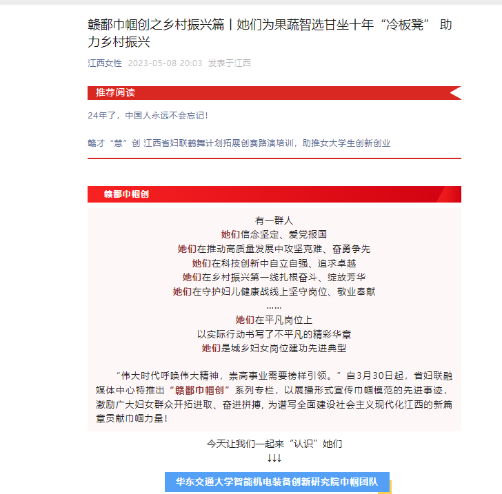 果蔬采后智能化分选设备研制过程复杂,环节紧扣,智能机电装备创新研究院巾帼团队把外柔内刚的铿锵玫瑰精神做到了极致,她们没有一个人退缩,更没有一个人喊苦,先后荣获江西省科技进步一等奖、江西省自然科学二等奖、江西省技术发明奖二等奖奖、山东省科技进步二等奖、中国仪器仪表学会科学技术一等奖、中国仪器仪表学会行业最高科技奖——陆婉珍院士科技奖等省部级奖励10项。团队主持完成国家“十一五”科技支撑计划项目、国家“863”计划课题、国家科技支撑重点项目、科技部成果转化基金项目、教育部新世纪优秀人才、国家自然科学基金项目等省部级以上课题30余项,项目总经费达4200余万元。发表论文高水平SCI/EI收录100篇,论文他引1300次,单篇他引176次,获“全国百篇优秀博士论文提名奖”,主编专著3部,参编教材3部,授权发明专利18项。为推动果蔬采后智能化分选装备革新和产业发展,在新农村建设、脱贫攻坚和乡村振兴路上,贡献了巾帼力量。