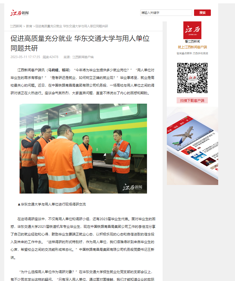 在与中国铁路南昌局集团有限公司车辆段、中国铁路呼和浩特集团有限公司等用人单位的座谈中,校企双方共同探讨了毕业生“慢就业、不就业”、用人单位“招聘需求与实际情况不匹配”等“问题清单”。调研组认真听取用人单位对学校就业工作及人才培养的建议,希望双方充分发挥各自优势,在产教融合、学生联合培养、毕业生就业创业等方面开展深度合作。调研中,校企双方达成共识,纷纷表示要坚持问题导向,为拓宽就业渠道提出新思路和新办法,切实为学生提供指导服务,提升就业育人质量。