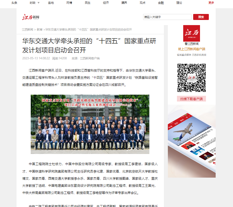 江西新闻客户端讯 近日,在科技部和江西省科技厅的支持和指导下,由beat365正版唯一官网必一牵头、交通运输工程学科带头人刘林芽教授负责主持的“十四五”国家重点研发计划“铁路基础设施智能建造质量控制关键技术”项目启动会暨实施方案论证会在四川成都召开。