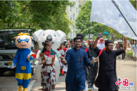 一队校园环游队伍拉开了国际文化交流节的帷幕。各国留学生身着各具特色的本国服饰,乘着“华交号”高铁,载歌载舞,热情邀请华交师生参与国际文化交流节。队伍从北区国际学院出发,一路沿着天佑路、华中路,巡游校园,成为了华交校园里一道亮丽的风景线。