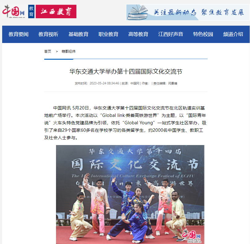近年来,该校持续深化对俄教育交流,挖掘校际国际合作新区,持续打造“交通特色,轨道核心”的中外人文交流品牌,国际化办学特色鲜明;先后与近50所国(境)外优秀大学建立交流合作关系,2021年12月成为教育部中国留学服务中心签署战略合作伙伴,2022年获批成为国家留学基金委“创新型人才国际合作培养项目”实施单位, 2022年12月获批“111计划”国家学科创新引智基地,招收近千名留学生就读,中外青年广泛参与到讲好中国故事、讲好江西故事的国际传播实践中去,国际交流能力显著提升。