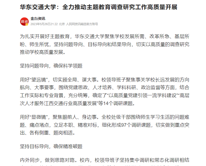 用好“望远镜”,切实顾全局、谋大事。校领导班子聚焦事关学校长远发展的方向航向、大事要事,围绕党建思政、人才培养、学科科研、政治监督等方面,结合工作实际和专业背景,充分统筹,确定了“以高质量党建引领一流学科建设”“高层次人才服务江西交通行业高质量发展”等14个调研课题。