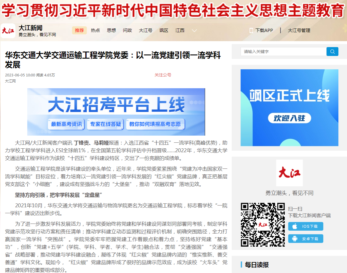 大江网/大江新闻客户端讯丁锋贵、马莉娅报道:入选江西省“十四五”一流学科(高峰优势),助力学校工程学学科进入ESI全球前1%,在全国第五轮学科评估中升档晋级……2022年,beat365正版唯一官网必一交通运输工程学科作为该校“十四五”学科建设特区,交出了一份亮眼的成绩单。