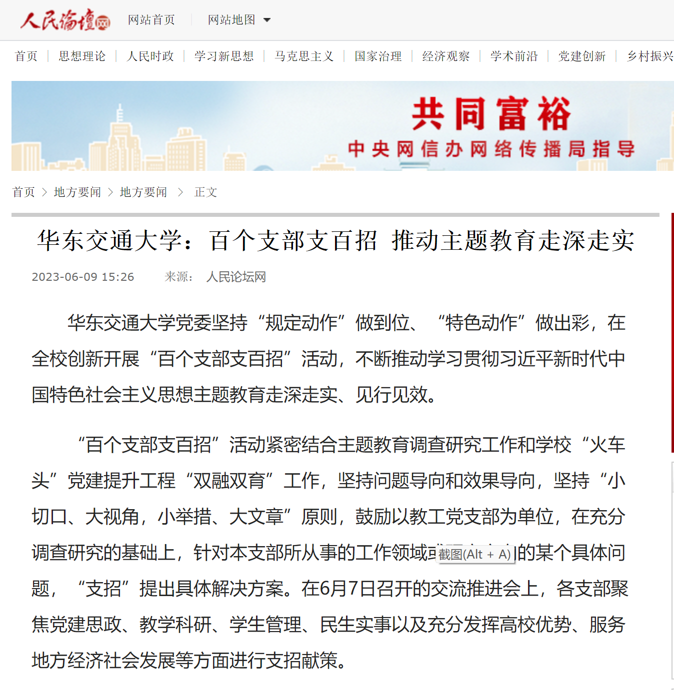 下真功夫,推动发展支硬招。“双百”“支招”,贵在实招管用、落地见效。首批40个教工党支部强化问题导向、坚持守正创新,形成问题清单40个,提出支招举措116条,推动落实举措42条,不断将调研成果转化为破解难题的新招妙招、改进工作的实招硬招。聚焦江西所需,土建学院岩土道路工程教工党支部充分发挥人才智力优势,与萍乡绕城高速公路项目党支部共建博士团创新工作室,共同打造人才培养、科技攻关、科普教育、教学示范基地,服务交通强省建设;聚焦学校所急,国际学院教工党支部精准对标综合考核的短板弱项,制定“七个一”任务清单,逐项攻坚突破,切实提高国际交流合作水平;聚焦师生所盼,华交产业集团直属党支部创新推出“智慧华交小铁”综合服务平台,全力打造校园智慧生活圈,让师生享受更加精细、多元、智能的提品增质服务。