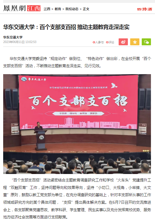 下真功夫,推动发展支硬招。“双百”“支招”,贵在实招管用、落地见效。首批40个教工党支部强化问题导向、坚持守正创新,形成问题清单40个,提出支招举措116条,推动落实举措42条,不断将调研成果转化为破解难题的新招妙招、改进工作的实招硬招。聚焦江西所需,土建学院岩土道路工程教工党支部充分发挥人才智力优势,与萍乡绕城高速公路项目党支部共建博士团创新工作室,共同打造人才培养、科技攻关、科普教育、教学示范基地,服务交通强省建设;聚焦学校所急,国际学院教工党支部精准对标综合考核的短板弱项,制定“七个一”任务清单,逐项攻坚突破,切实提高国际交流合作水平;聚焦师生所盼,华交产业集团直属党支部创新推出“智慧华交小铁”综合服务平台,全力打造校园智慧生活圈,让师生享受更加精细、多元、智能的提品增质服务。