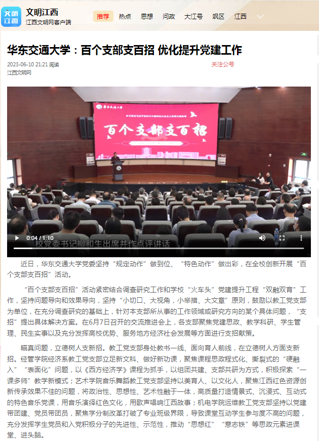 下真功夫,推动发展支硬招。“双百”“支招”,贵在实招管用、落地见效。首批40个教工党支部强化问题导向、坚持守正创新,形成问题清单40个,提出支招举措116条,推动落实举措42条,不断将调研成果转化为破解难题的新招妙招、改进工作的实招硬招。聚焦江西所需,土建学院岩土道路工程教工党支部充分发挥人才智力优势,与萍乡绕城高速公路项目党支部共建博士团创新工作室,共同打造人才培养、科技攻关、科普教育、教学示范基地,服务交通强省建设;聚焦学校所急,国际学院教工党支部精准对标综合考核的短板弱项,制定“七个一”任务清单,逐项攻坚突破,切实提高国际交流合作水平;聚焦师生所盼,华交产业集团直属党支部创新推出“智慧华交小铁”综合服务平台,全力打造智慧校园生活圈,让师生享受更加精细、多元、智能的提品增质服务。