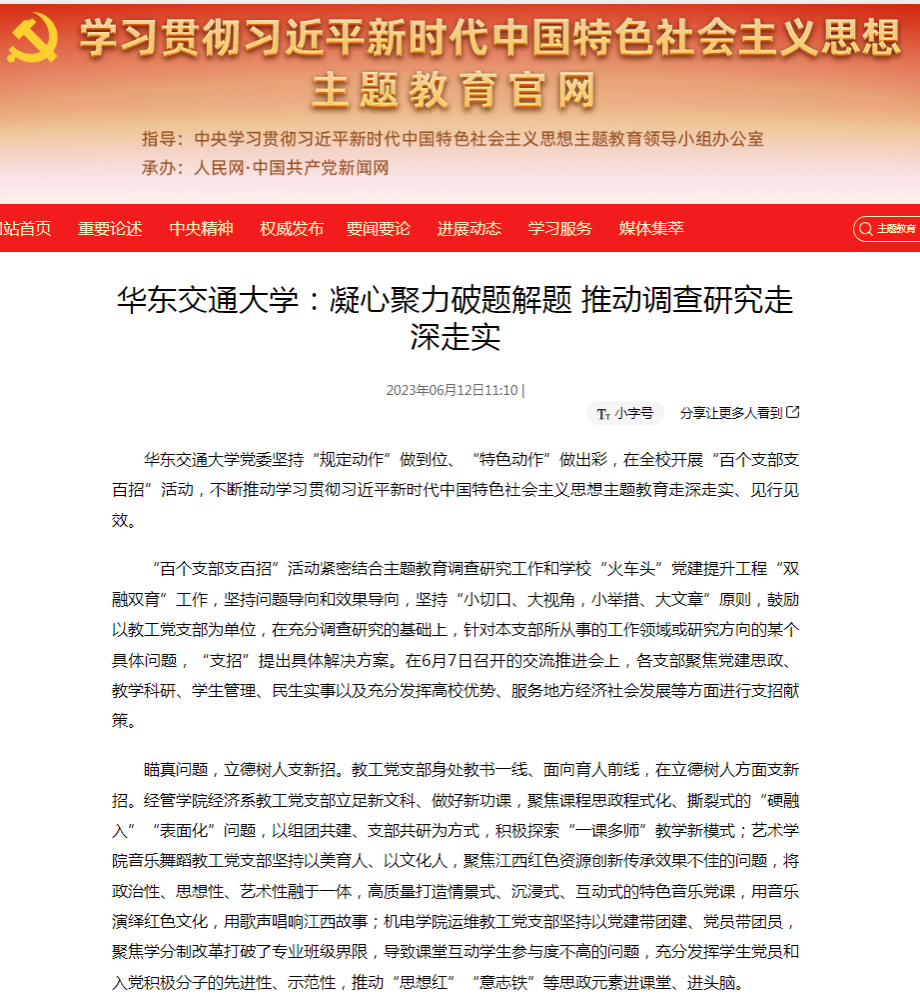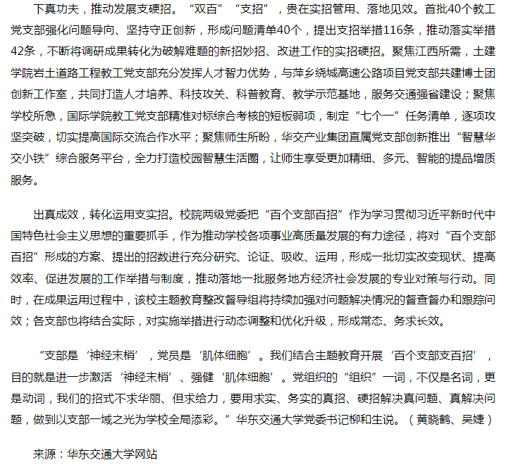 下真功夫,推动发展支硬招。“双百”“支招”,贵在实招管用、落地见效。首批40个教工党支部强化问题导向、坚持守正创新,形成问题清单40个,提出支招举措116条,推动落实举措42条,不断将调研成果转化为破解难题的新招妙招、改进工作的实招硬招。聚焦江西所需,土建学院岩土道路工程教工党支部充分发挥人才智力优势,与萍乡绕城高速公路项目党支部共建博士团创新工作室,共同打造人才培养、科技攻关、科普教育、教学示范基地,服务交通强省建设;聚焦学校所急,国际学院教工党支部精准对标综合考核的短板弱项,制定“七个一”任务清单,逐项攻坚突破,切实提高国际交流合作水平;聚焦师生所盼,华交产业集团直属党支部创新推出“智慧华交小铁”综合服务平台,全力打造校园智慧生活圈,让师生享受更加精细、多元、智能的提品增质服务。