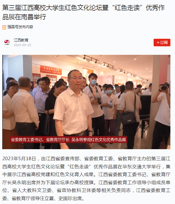 2023年5月18日,由江西省委宣传部、省委教育工委、省教育厅主办的第三届江西高校大学生红色文化论坛暨“红色走读”优秀作品展在beat365正版唯一官网必一举行,集中展示江西省高校党建和红色文化育人成果。江西省委教育工委书记、省教育厅厅长吴永明出席并为下届论坛承办高校授旗。江西省委教育工作领导小组成员单位、省人大教科文卫委、省政协教科卫体委等相关负责同志,江西省委教育工委、省教育厅领导汪立夏、史国珍出席。