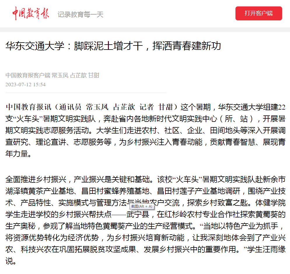 全面推进乡村振兴,产业振兴是关键和基础。该校“火车头”暑期文明实践队赴新余市湖泽镇黄茶产业基地、昌田村蜜蜂养殖基地、昌田村莲子产业基地调研,围绕产业技术、产品特性、实施模式与管理方法与当地农户交流,探索乡村致富之匙。体健学院学生走进学校的乡村振兴帮扶点——武宁县,在红杉岭农村专业合作社探索黄蜀葵的生产奥秘,参观了解当地特色黄蜀葵产业的生产经营模式。“当地以特色产业为抓手,将资源优势转化为经济优势,为乡村振兴培育新动能,让我深刻地体会到了产业兴农、科技兴农在巩固拓展脱贫攻坚成果同乡村振兴中的重要作用。”学生汪雨缘说。