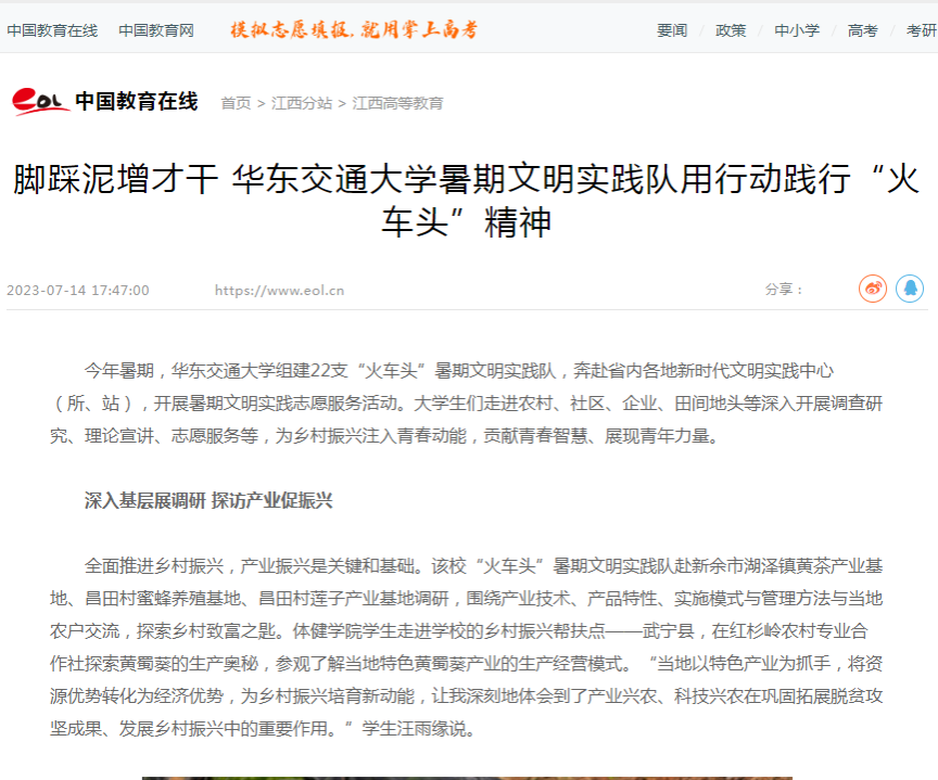 勇当“火车头”,青春建新功。beat365正版唯一官网必一暑期文明实践队以实干书写奋进,以实践淬炼青春,在广袤的田间地头上好与现实相结合的“大思政课”,用双肩担当“铁”的使命,用行动诠释“铁”的精神,用汗水浇灌良田,将专业所长用于振兴乡村经济和产业发展,争做有理想、敢担当、能吃苦、肯奋斗的新时代青年。