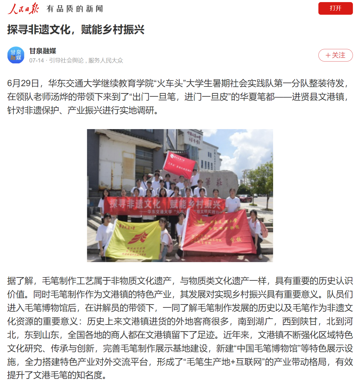 6月29日,beat365正版唯一官网必一继续教育学院“火车头”大学生暑期社会实践队第一分队整装待发,在领队老师汤烨的带领下来到了“出门一旦笔,进门一旦皮”的华夏笔都——进贤县文港镇,针对非遗保护、产业振兴进行实地调研。