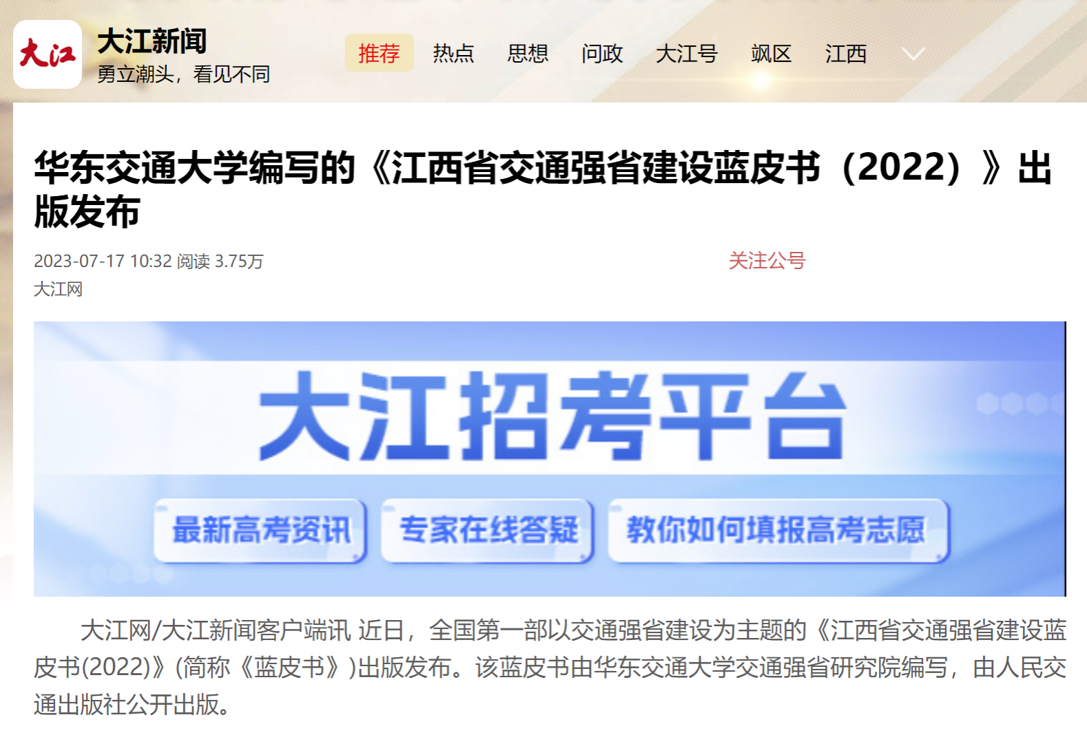 近日,全国第一部以交通强省建设为主题的《江西省交通强省建设蓝皮书(2022)》(简称《蓝皮书》)出版发布。该蓝皮书由beat365正版唯一官网必一交通强省研究院编写,由人民交通出版社公开出版。