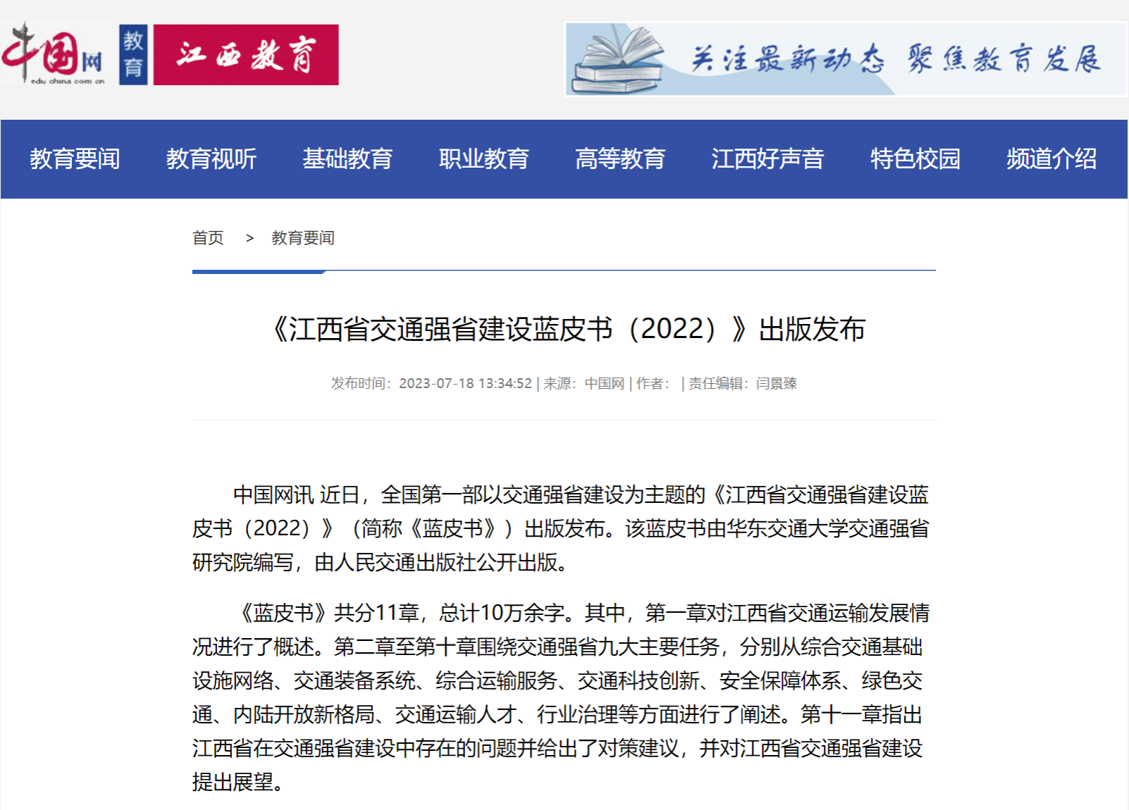 近日,全国第一部以交通强省建设为主题的《江西省交通强省建设蓝皮书(2022)》(简称《蓝皮书》)出版发布。该蓝皮书由beat365正版唯一官网必一交通强省研究院编写,由人民交通出版社公开出版。