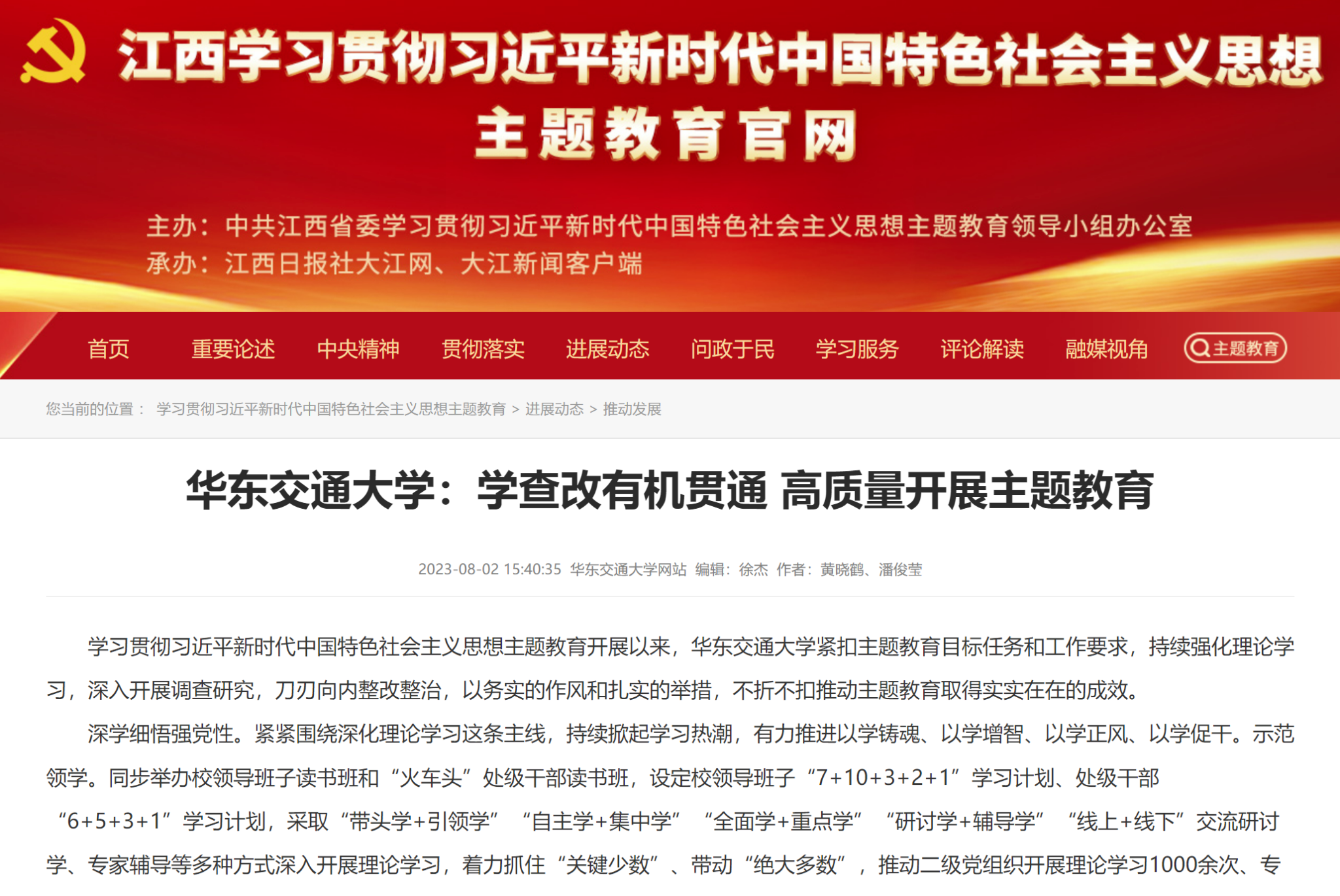 调查研究强本领。聚焦学校发展所需、改革所急、基层所盼、师生所忧,大兴调查研究之风,切实把情况摸清、把对策提实,形成了一批高质量调研成果。校级层面,校领导、校党委委员立足主责主业、聚焦大事要事,围绕党建思政、人才培养、学科科研、政治监督等方面,确定了“以高质量党建引领一流学科建设”“高层次人才服务江西交通行业高质量发展”等13个调研领题和3个典型案例解剖式调研课题,共开展各类调研82次,形成调研报告16篇;提出工作改进措施75条,形成13条调研成果转化运用、59项具体转化举措。二级党组织层面,着眼于师生群众身边问题难题、痛点堵点,全校41个单位细化形成97个调研课题,102名党员领导干部深入基层实地调研200余次;提出工作改进措施339条,形成调研报告77篇。创新开展“百个支部支百招”活动,激活支部“神经末梢”、强健党员“肌体细胞”,94个基层教工党支部共提出239条支招举措,目前已推动落实106条,成果转化运用13个。