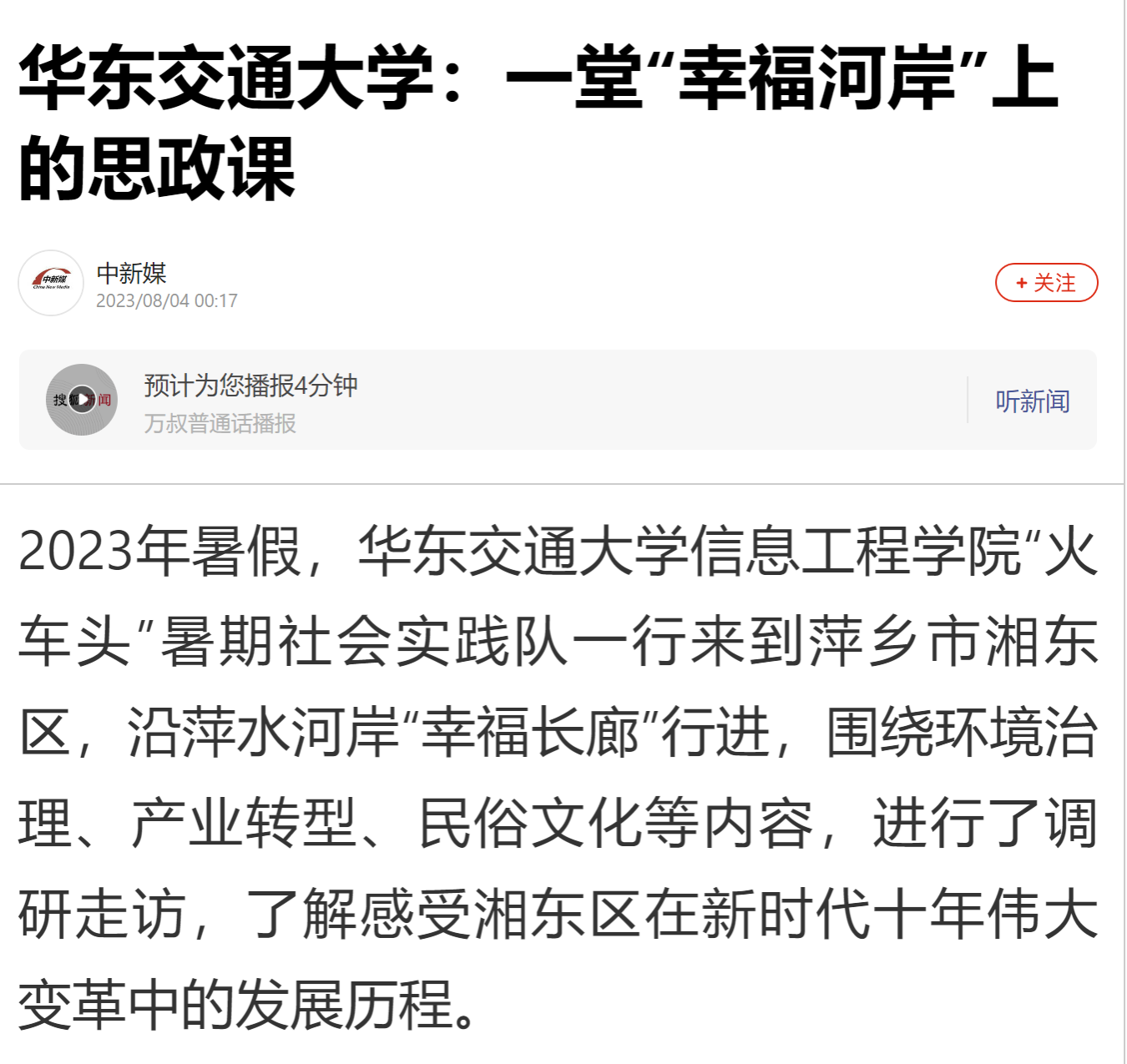 2023年暑假,beat365正版唯一官网必一信息工程学院“火车头”暑期社会实践队一行来到萍乡市湘东区,沿萍水河岸“幸福长廊”行进,围绕环境治理、产业转型、民俗文化等内容,进行了调研走访,了解感受湘东区在新时代十年伟大变革中的发展历程。