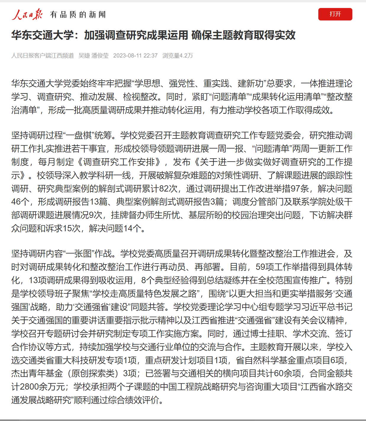 坚持调研内容“一张图”作战。学校党委高质量召开调研成果转化暨整改整治工作推进会,及时对调研成果转化和整改整治工作进行再动员、再部署。目前,59项工作举措得到具体转化,13项调研成果得到吸收运用,8个典型经验得到总结凝练并在全校范围宣传推广。特别是学校领导班子聚焦“学校走高质量特色发展之路”,围绕“以更大担当和更实举措服务‘交通强国’战略,助力‘交通强省’建设”同题共答。学校党委理论学习中心组专题学习习近平总书记关于交通强国的重要讲话重要指示批示精神以及江西省推进“交通强省”建设有关会议精神,学校召开专题研讨会并研究制定专项工作实施方案。同时,通过博士挂职、学术交流、签订合作协议等方式,持续加强学校与交通行业单位的交流与合作。主题教育开展以来,学校入选交通类省重大科技研发专项1项,重点研发计划项目1项,省自然科学基金重点项目6项,杰出青年基金(原创探索类)3项;已签署与交通相关的横向项目共计60余项,合同金额共计2800余万元;学校承担两个子课题的中国工程院战略研究与咨询重大项目“江西省水路交通发展战略研究”顺利通过综合绩效评价。