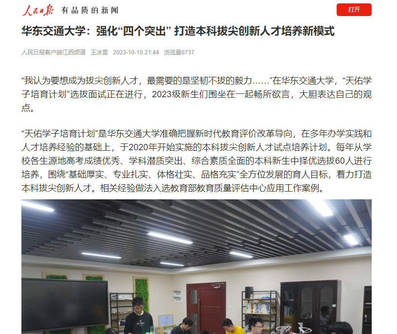 拔尖创新人才培养是一项长期性、系统性的工程。学校始终将人才培养质量作为衡量立德树人实效的重要标尺,坚持做好顶层设计、统筹推进,形成了党委统一领导、党政齐抓共管、部门协同联动、院系共同推进的工作格局,解决了培养举措落实过程中专业间分离、院系间分隔、部门与院系间分治现象,实现了学校、院系、师生各个层面在思想上同心、在目标上同向、在行动上同行,为学生们的成长发展保驾护航。近日获评“全国大学生自强之星”的“天佑学子”何政毅说:“是学校不断创新的培养模式给我创造了成长发展的平台,我的梦想在这里扬帆启航,未来我将再接再厉,为建设科技强国贡献青春力量。”