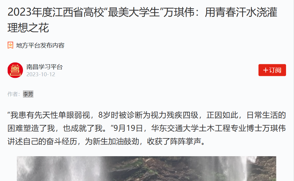 万琪伟出生在江西省南昌县一个农民家庭,他身残志坚,自强不息,学习非常刻苦。“我始终相信知识能改变命运,也坚信在求知路上一定能收获属于自己的风景。”万琪伟说。