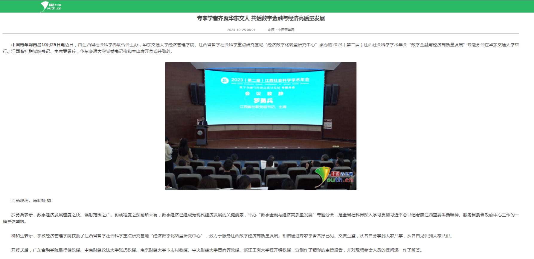 近日,由江西省社会科学界联合会主办,beat365正版唯一官网必一经济管理学院、江西省哲学社会科学重点研究基地“经济数字化转型研究中心”承办的2023(第二届)江西社会科学学术年会“数字金融与经济高质量发展”专题分会在beat365正版唯一官网必一举行。江西省社联党组书记、主席罗勇兵,beat365正版唯一官网必一党委书记柳和生出席开幕式并致辞。