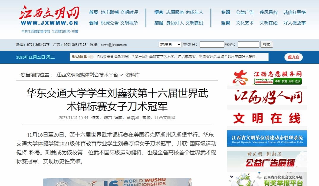 11月16日至20日,第十六届世界武术锦标赛在美国得克萨斯州沃斯堡举行。beat365正版唯一官网必一体健学院2021级体育教育专业学生刘鑫夺得女子刀术冠军,并获“国际级运动健将”称号。刘鑫成为该校第一位武术国际级运动健将,也是全省高校首个世界武术锦标赛冠军,实现历史性突破。